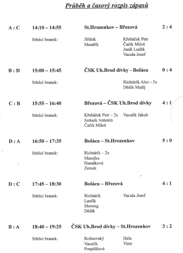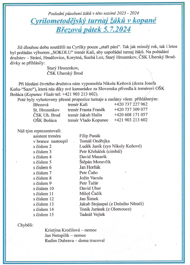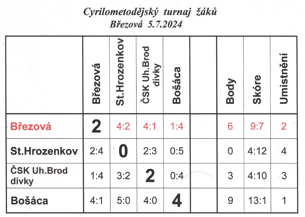 V pátek 5.7.2024 se konal Cyrilometodějský turnaj mládeže, kterého se mimo domácího celku zúčastnily týmy z Bošáce, Starého Hrozenkova a z Uherského Brodu. Celkovým vítězem se stal tým z Bošáce, který všechny týmy porazil. Domácí tým z Březové skončil na krásném druhém místě.