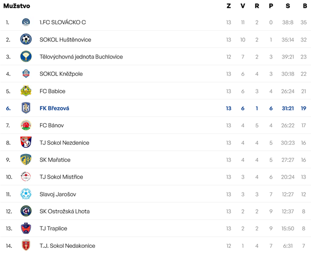 | 6. | FK Březová | 13 | 31:21 | 19 |